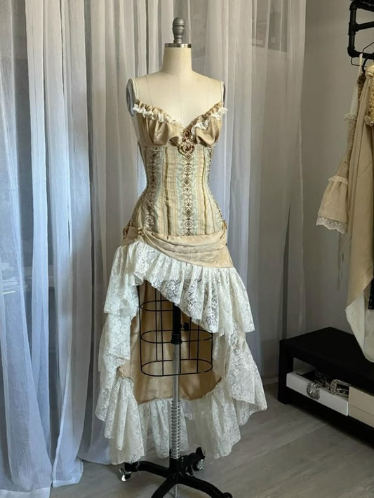 Champagne Gold Retro Fashion Exquisite Lace Elegant Long Satin Princess Court Style Ball Gown Evening Gown Party Dress nv3595