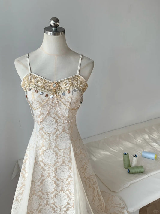 Champagne Gold Vintage Elegant Princess Beaded Long Ball Gown Evening Gown Party Dress nv2598