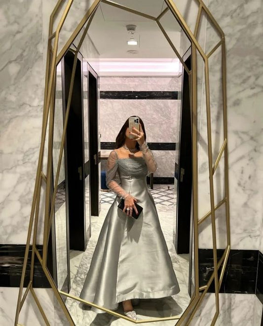 Champagne gold/grey sequined long sleeves charming off-the-shoulder long prom dress party dress nv5295