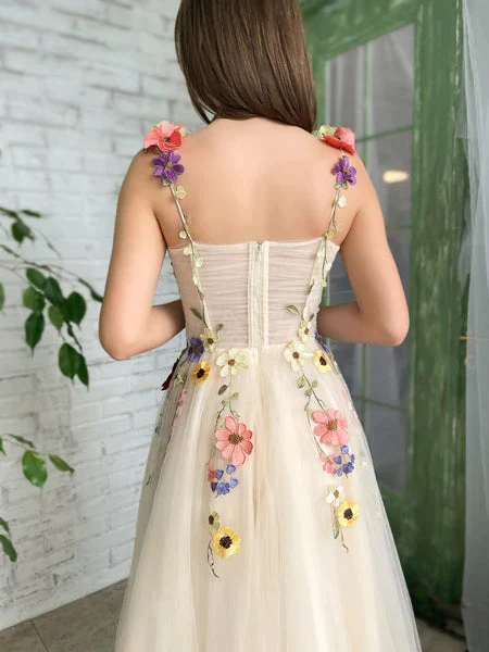 Champagne Tulle Tea Length Formal Dress with Flowers, Champagne Prom Dress nv525
