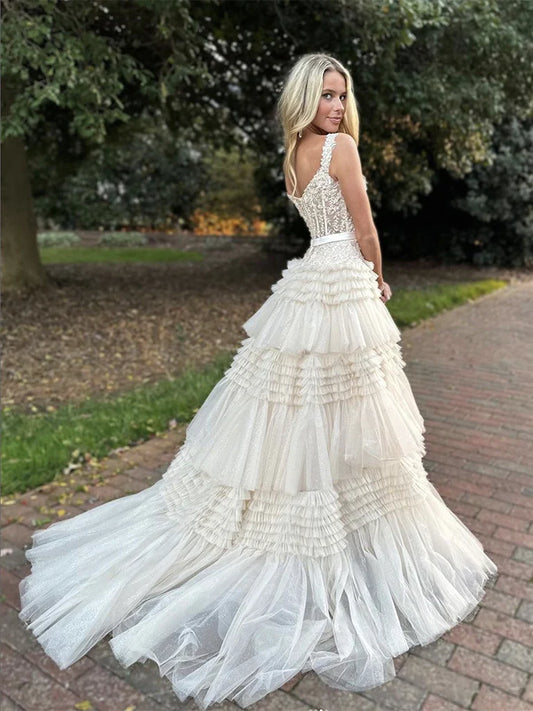 Champagne Vintage Delicate Floral Lace Long Tulle Elegant Floor-Length Ball Gown Evening Dress Wedding Dress nv3755