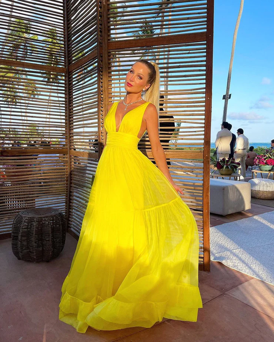 Charming A Line V Neck Yellow Chiffon Evening Dresses nv975