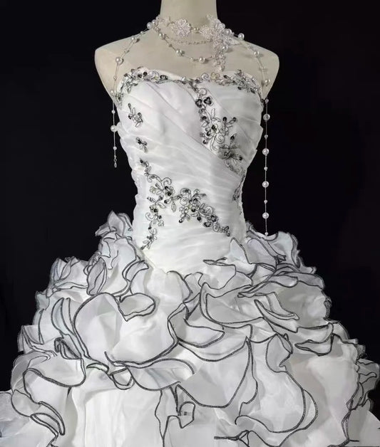 White Halter Strapless Beaded Embroidery Voluminous Ball Gown with Multi-layer Ruffled Trim NV6869