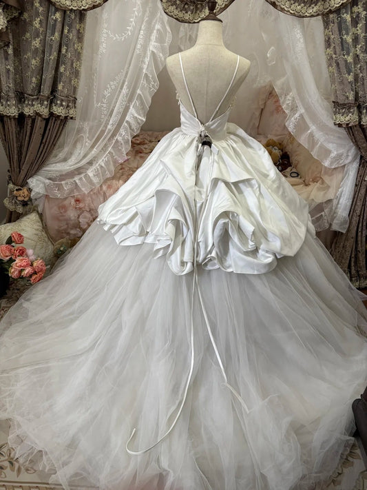 Vintage Princess Style Ivory 3D Floral Appliqué Spaghetti Straps Deep V-neck Open Back Satin Ball Gown Wedding Dress with Train NV6867