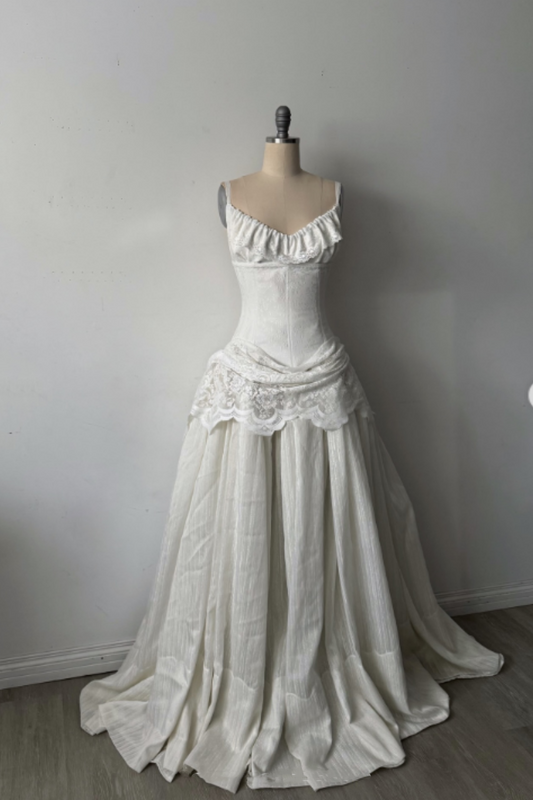 White Strapless Ruched Lace Panel High-Waist Gown NV6253