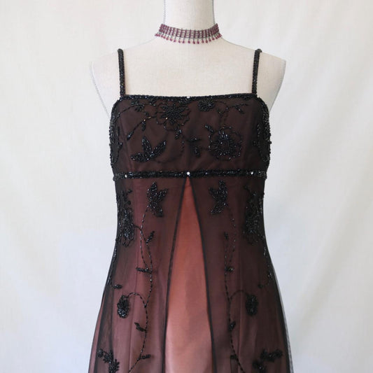 ✨Retro Empire Dress Pink Brown Exquisite Beaded Long Tulle Prom Dress Evening Dress Party Dress nv4993