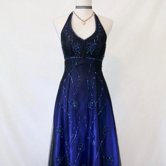 🥀 Vintage Dark Blue Glitter Ombre Beaded Long Tulle Ball Gown Evening Dress Party Dress nv4980
