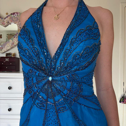 Blue Vintage Rhinestone Halter Neck Long Satin Prom Gown Evening Dress Party Dress nv4664