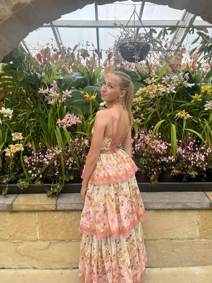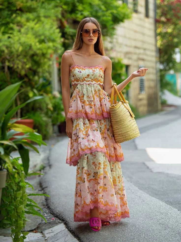 A-Line Floral Print Halter Long Prom Gown Tiered Formal Party Dress Maxi Dress nv2675