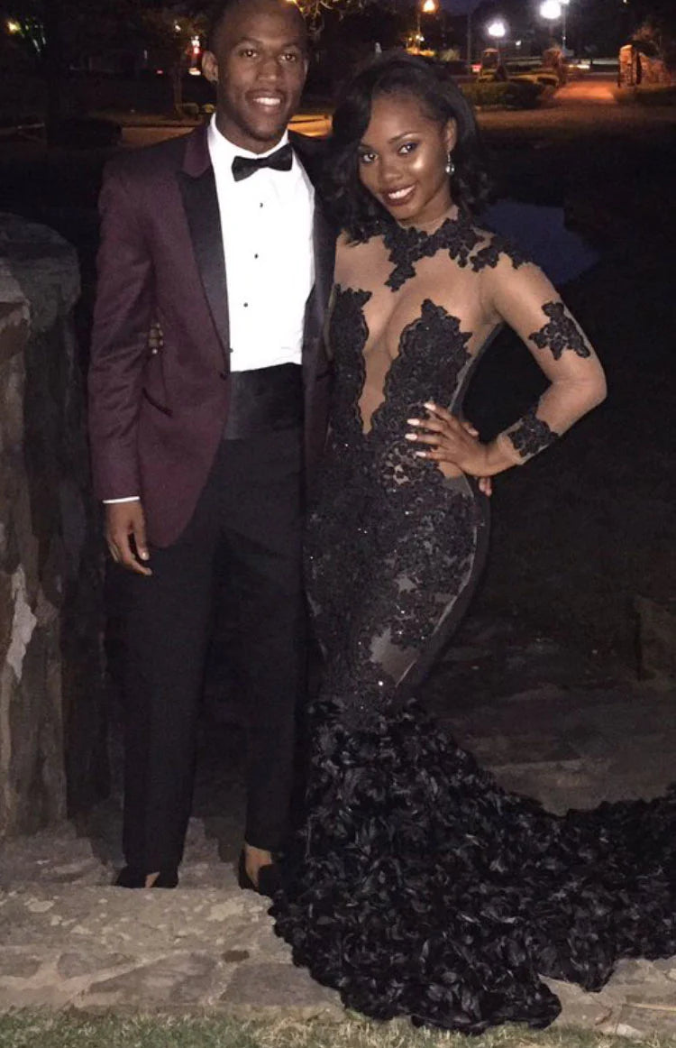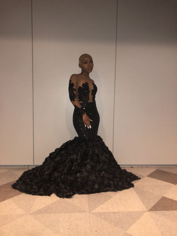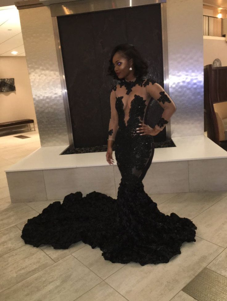 Black sexy elegant mermaid see-through long tail long sleeve ruffled ball gown evening dress nv3227