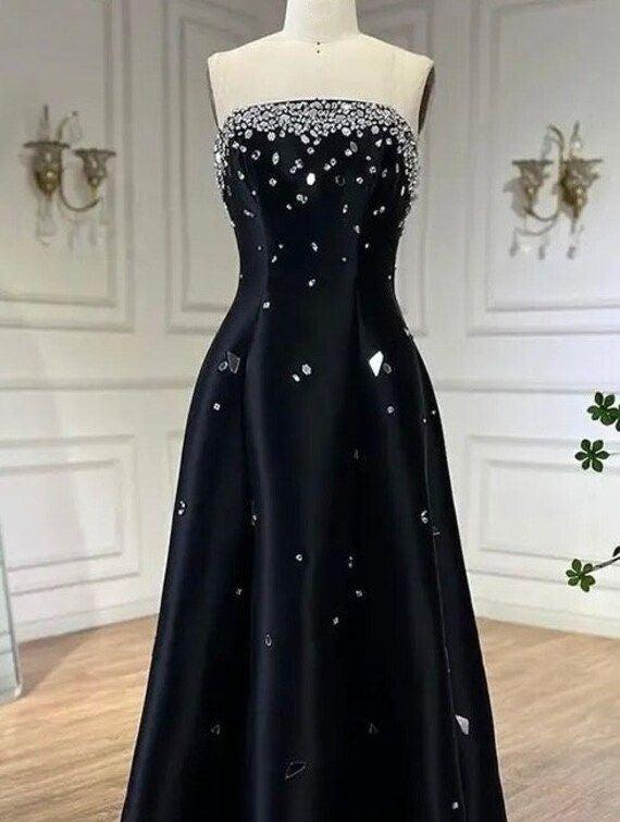 Black Shiny Elegant Crystal Mirror Decoration Off Shoulder A-Line Long Satin Ball Gown Evening Dress nv3158