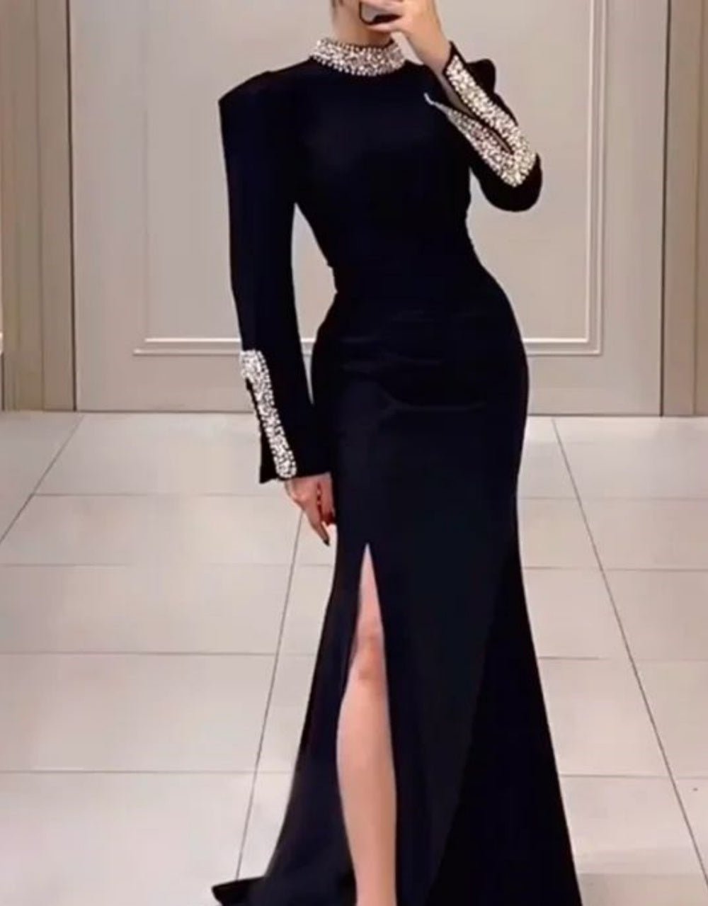 Black shiny elegant long slit satin sequin ball gown evening dress nv3177