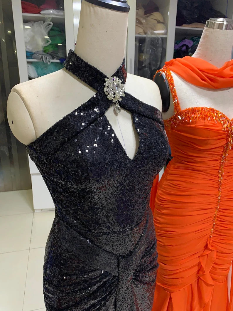 Black shiny sequins vintage elegant jewel long ball gown evening dress nv3124