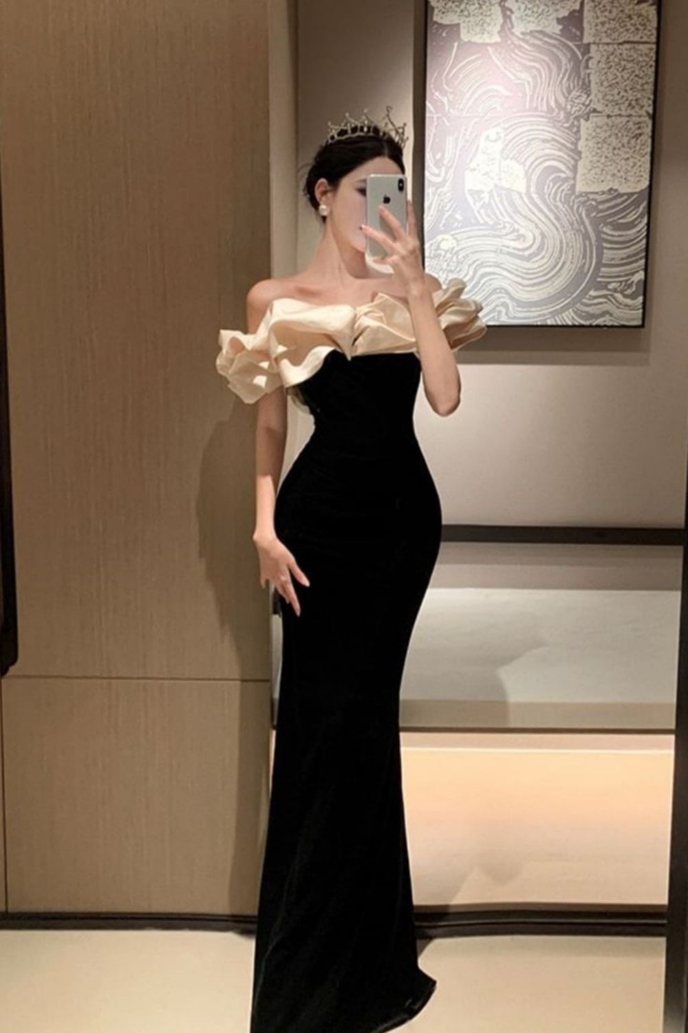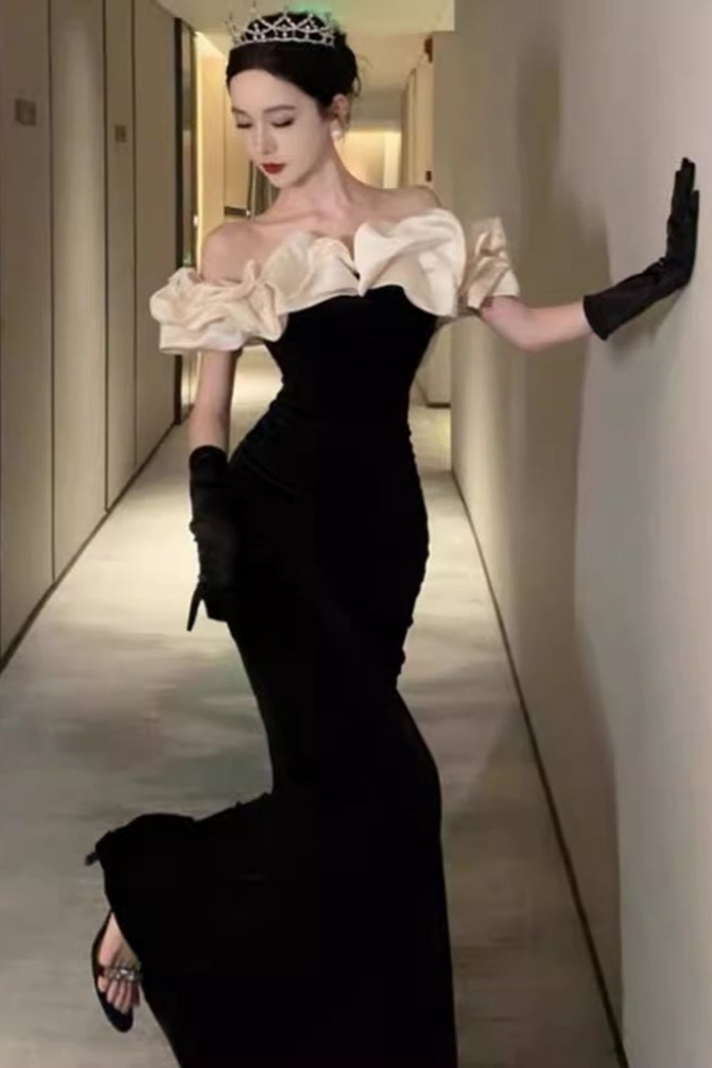Black velvet off-the-shoulder ruffled neckline long mermaid slim elegant ball gown evening dress nv3180