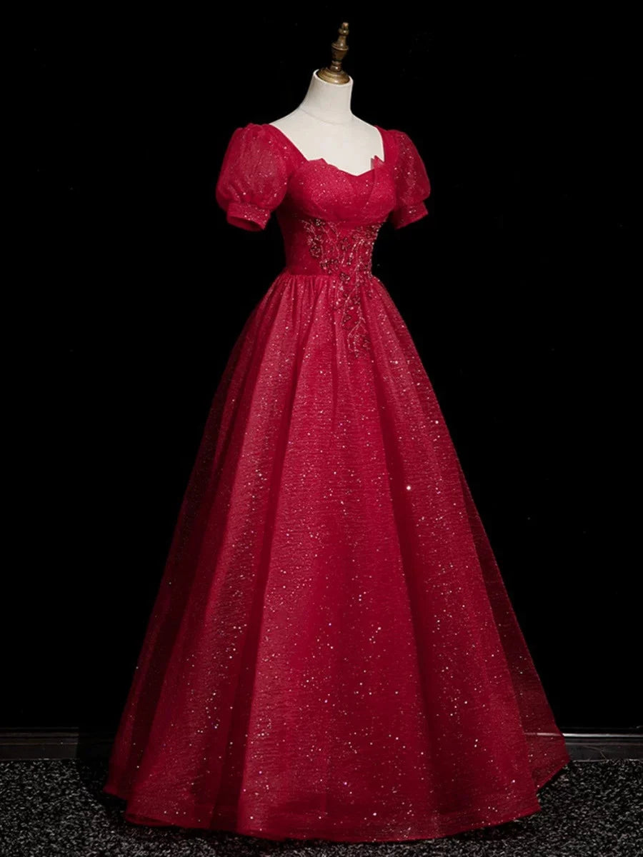 Burgundy Beaded Short Sleeve A-Line Party Dress Tulle Long Prom Dress Evening Dress nv4280