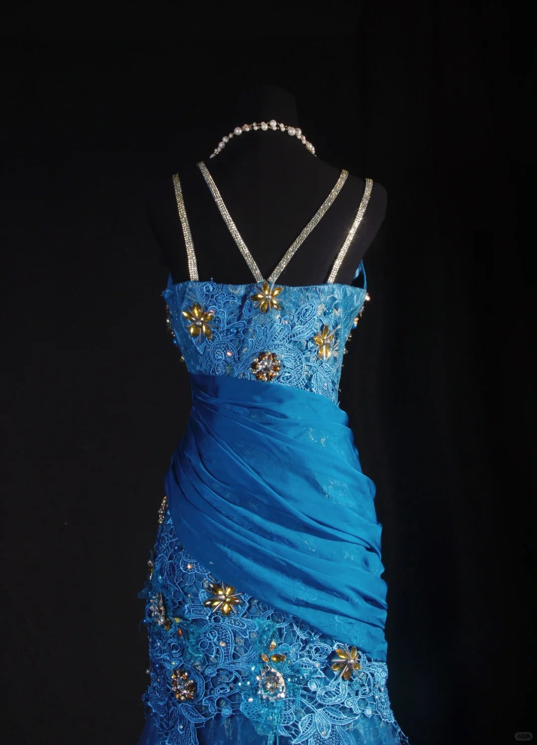 Fantasy blue exquisite floral beading long lace satin prom dress party dress vintage nv5211