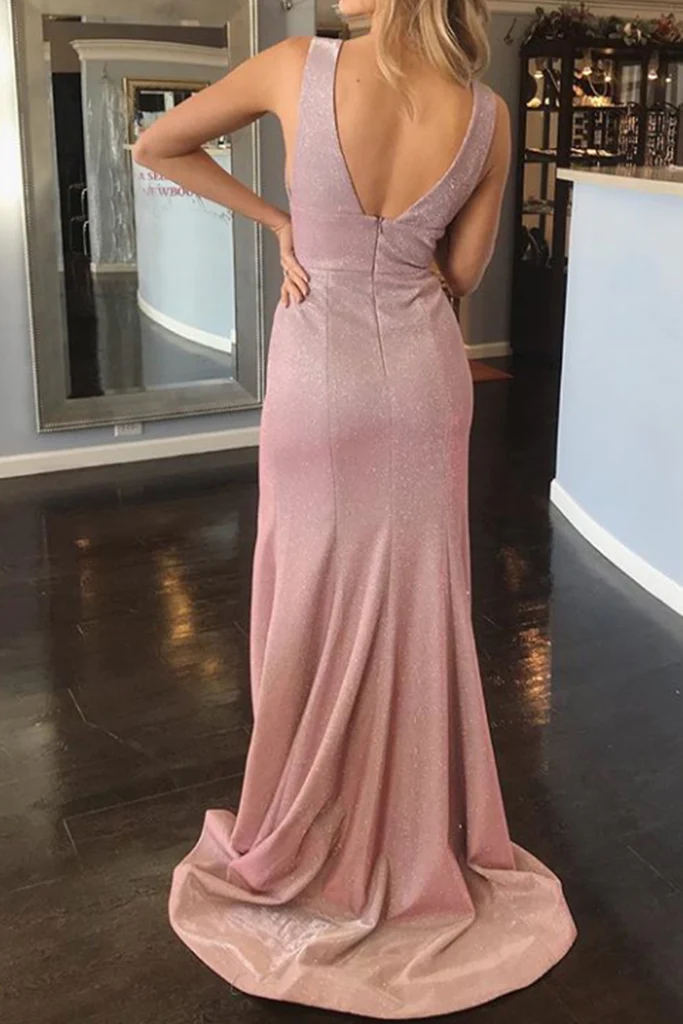 Straps V Neck Sheath Maxi Prom Dress with Slit Fuchsia Silver Formal Evening Gown nv806