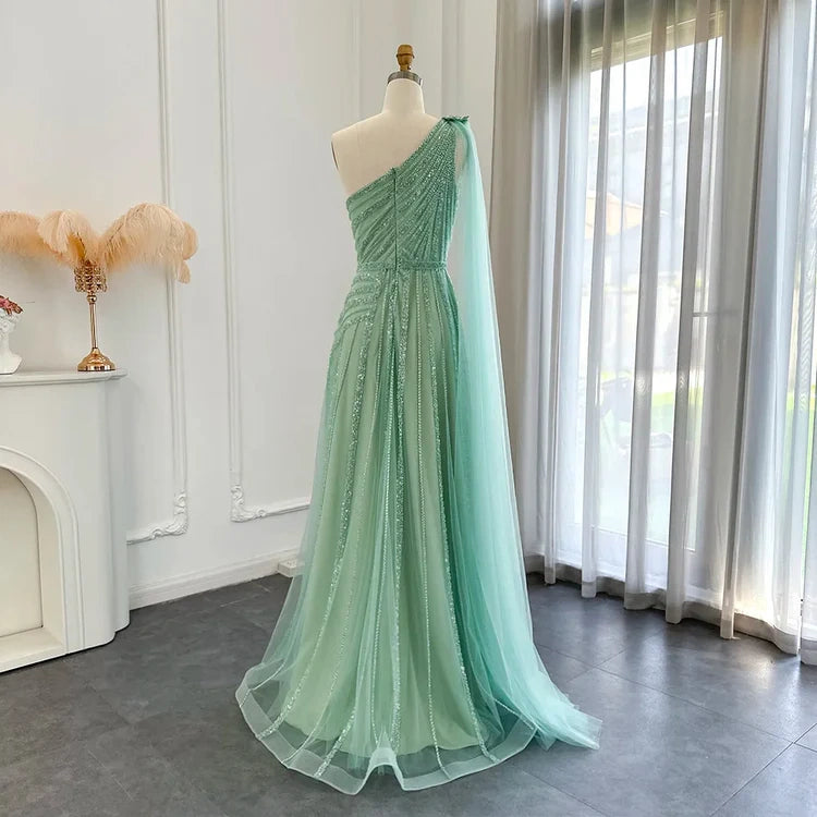 Green Luxury One Shoulder Sparkling Beaded Long Ball Gown Evening Gown with Sequins Party Dress nv2683