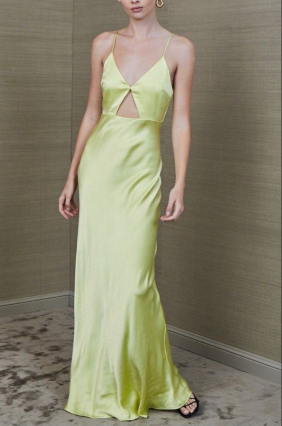 Yellow Green Spaghetti Strap Hollow Satin Ball Gown Evening Dress Party Dress nv1849
