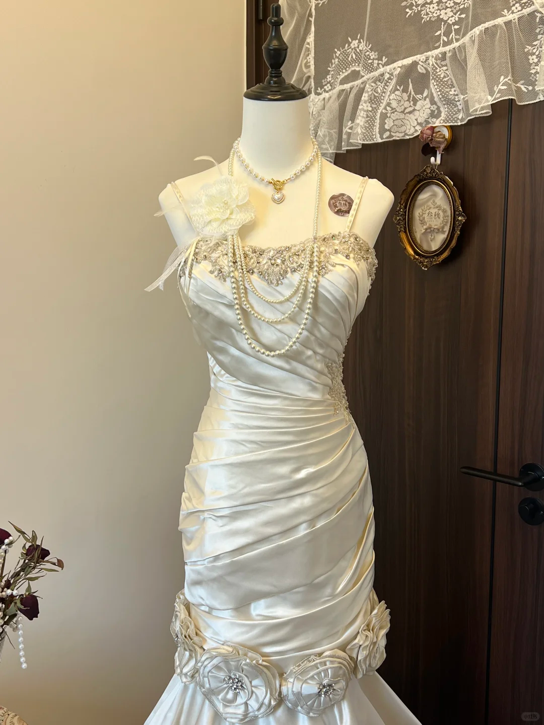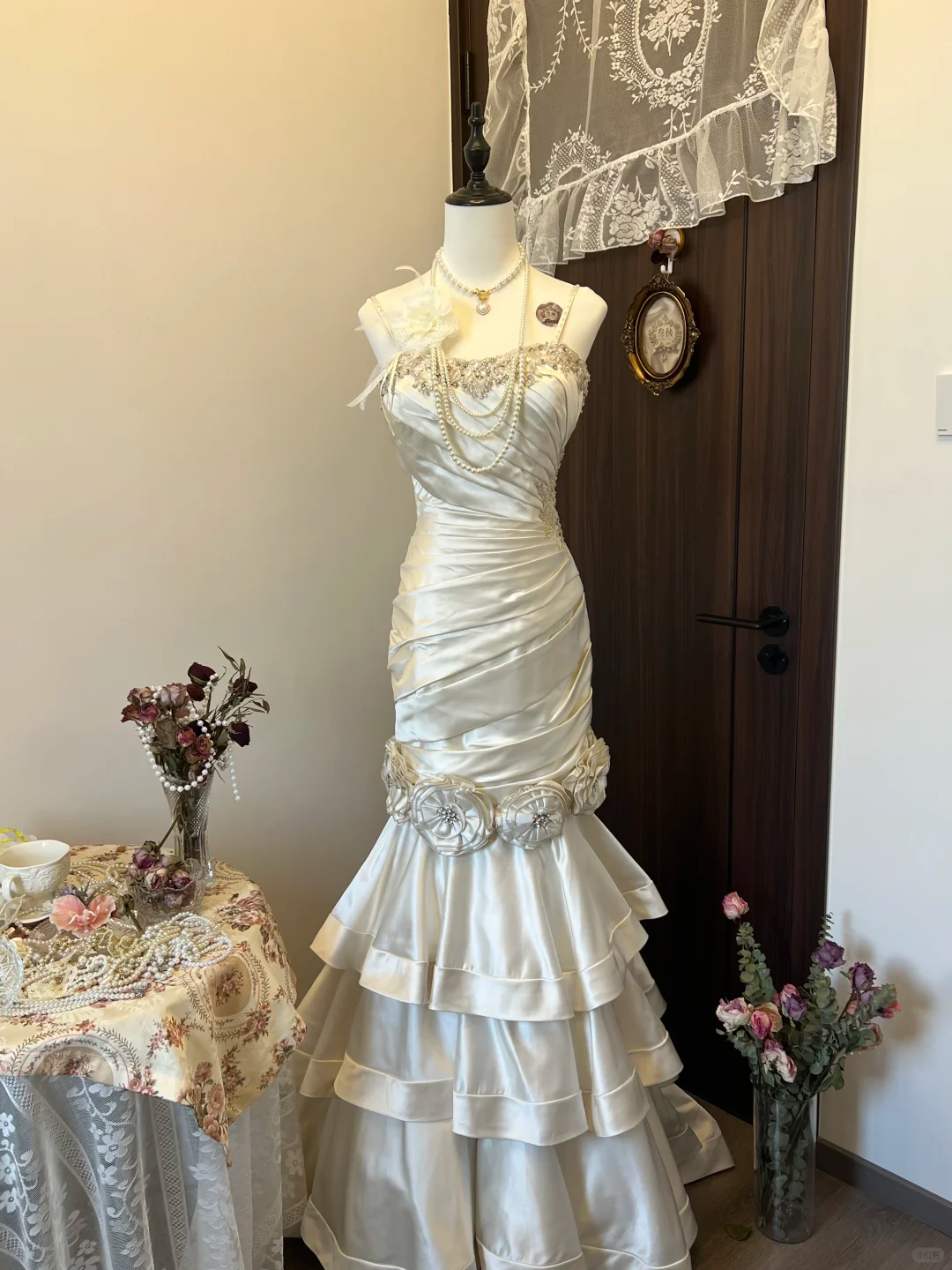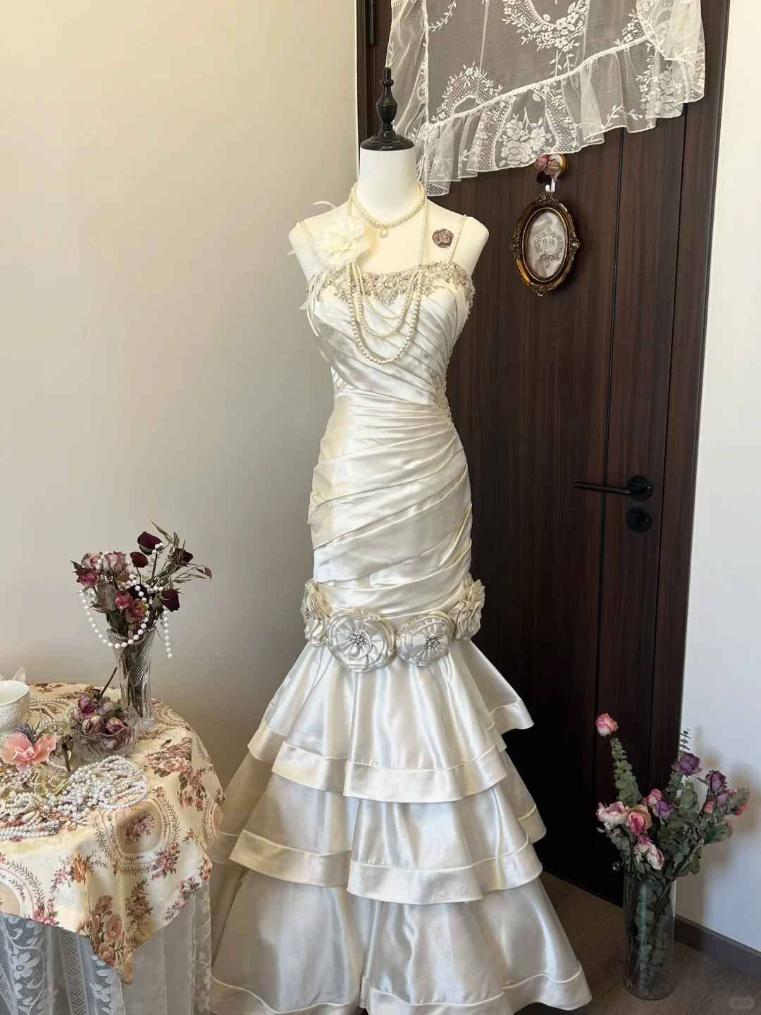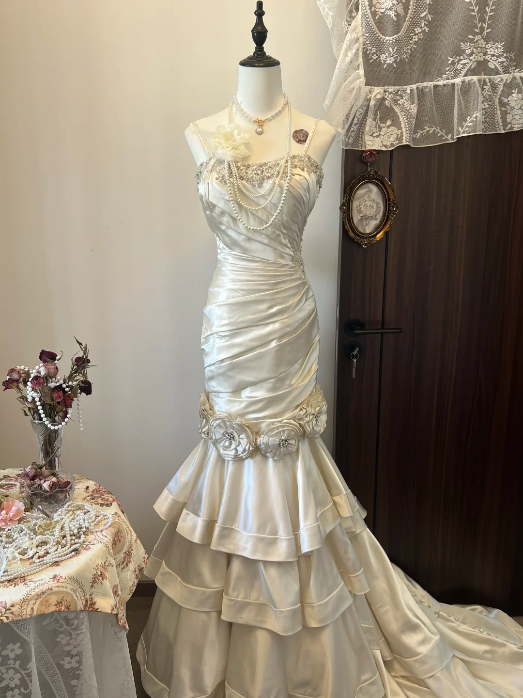 Ivory White Floral Beaded Long Satin Ball Gown Evening Gown Wedding Dress nv4216