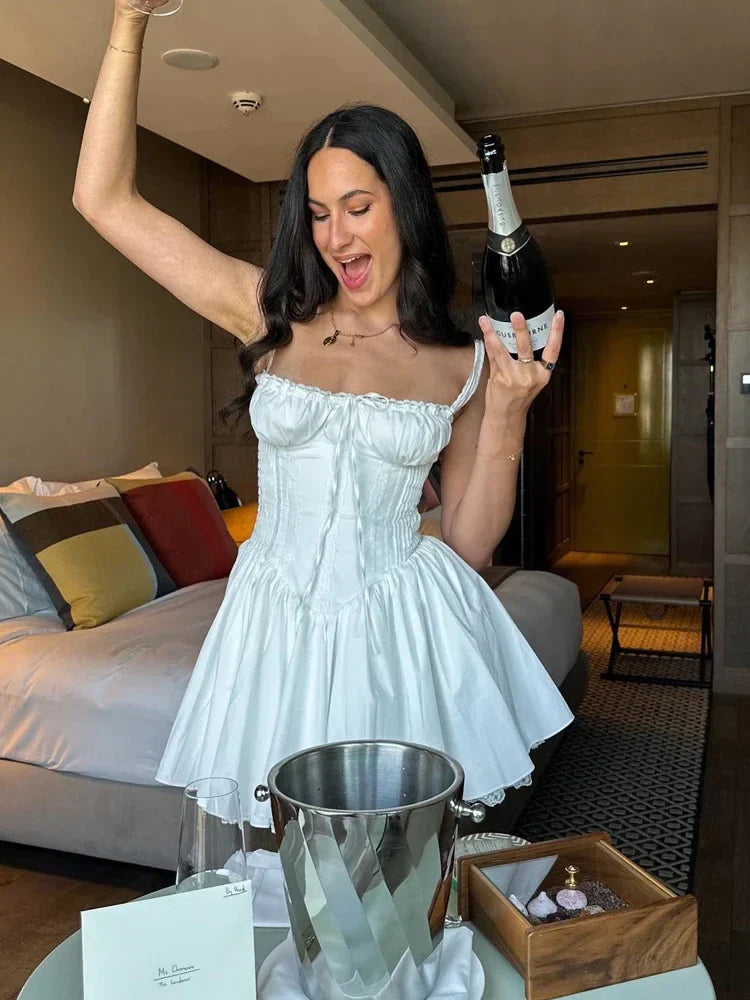 Lace Backless Pleated Short Skirt Slim Fit Corset Sexy Mini Dress French Elegant White Gown nv1712