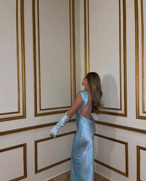 Light Blue Mermaid Slim Sleeveless Long Satin Ball Gown Evening Dress nv3118