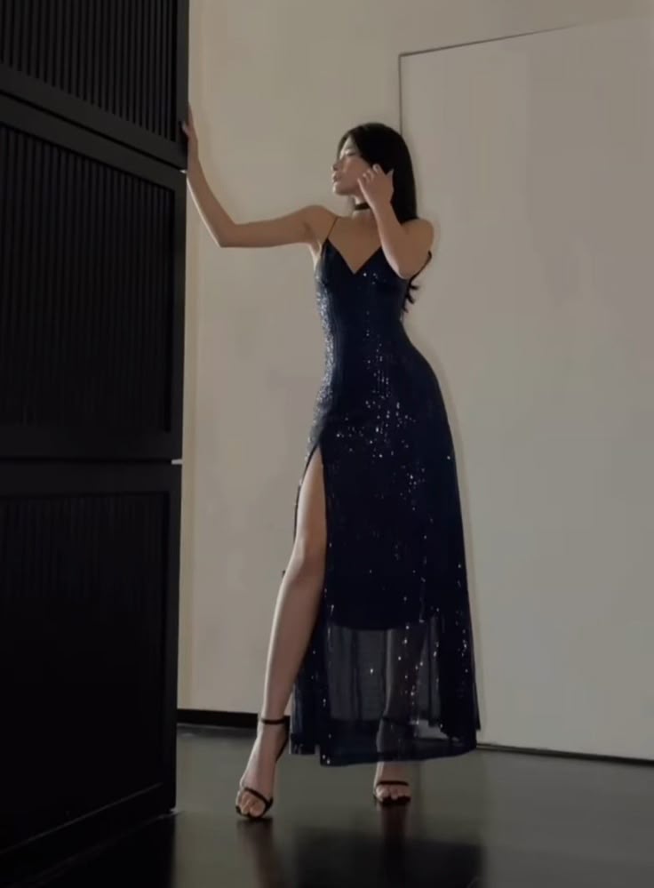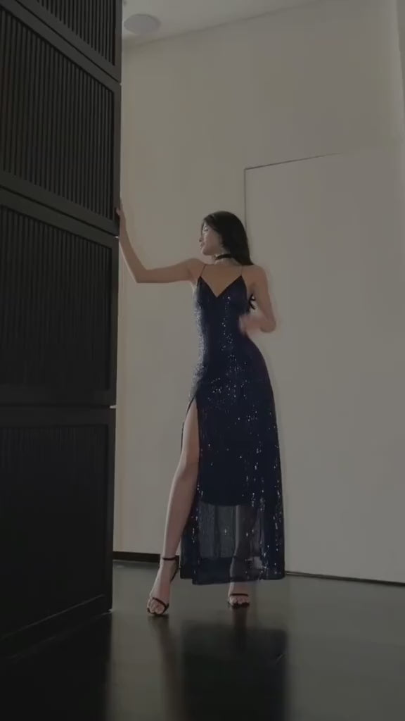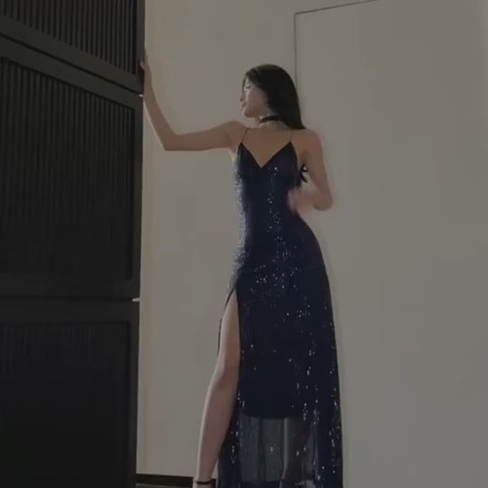 Navy Blue Fashion Elegant Low Cut V Neck Sequined Long Tulle Slit Evening Dress Prom Party Dress nv2609
