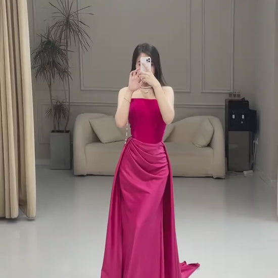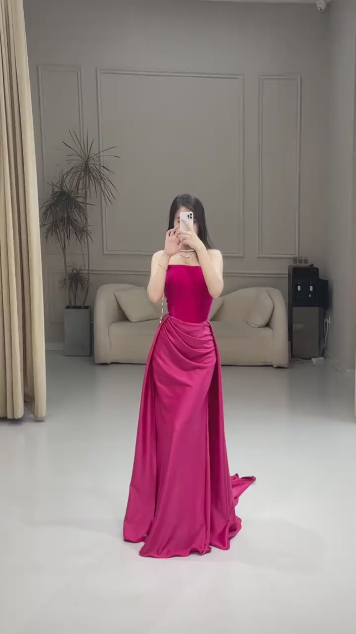 Pink simple fashion elegant tube top off shoulder long velvet satin stitching pleated long evening dress prom dress party dress nv2610