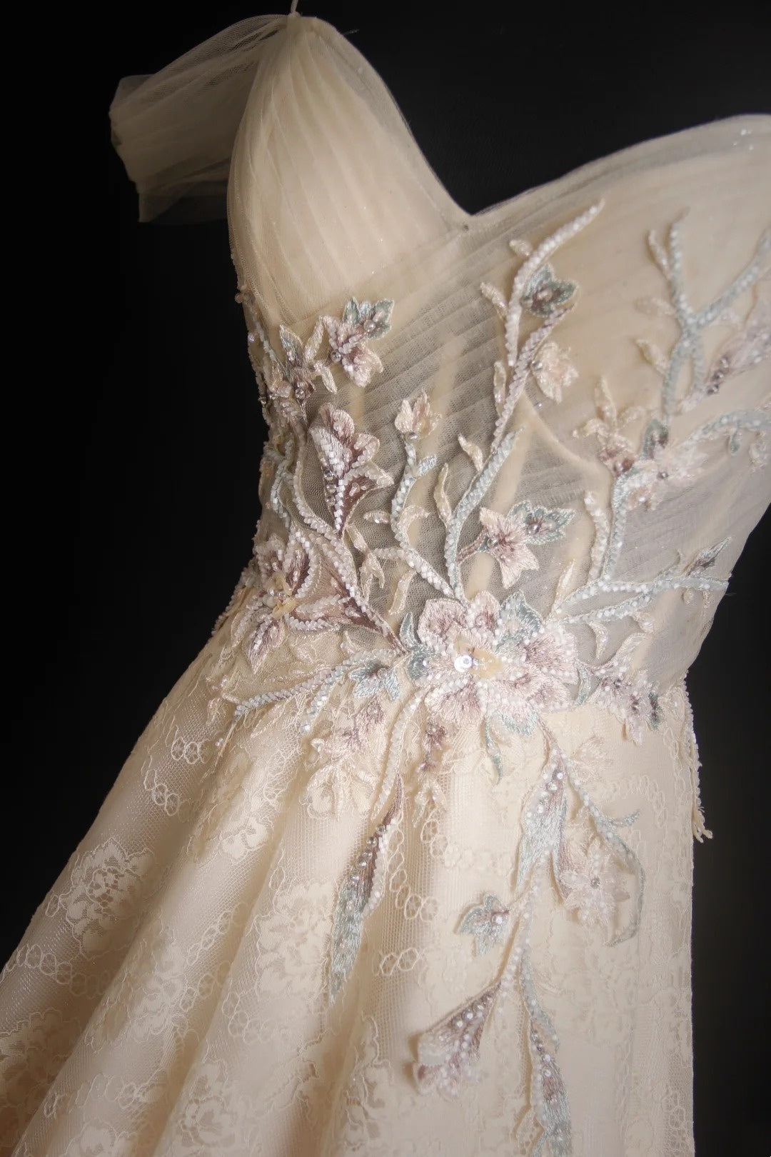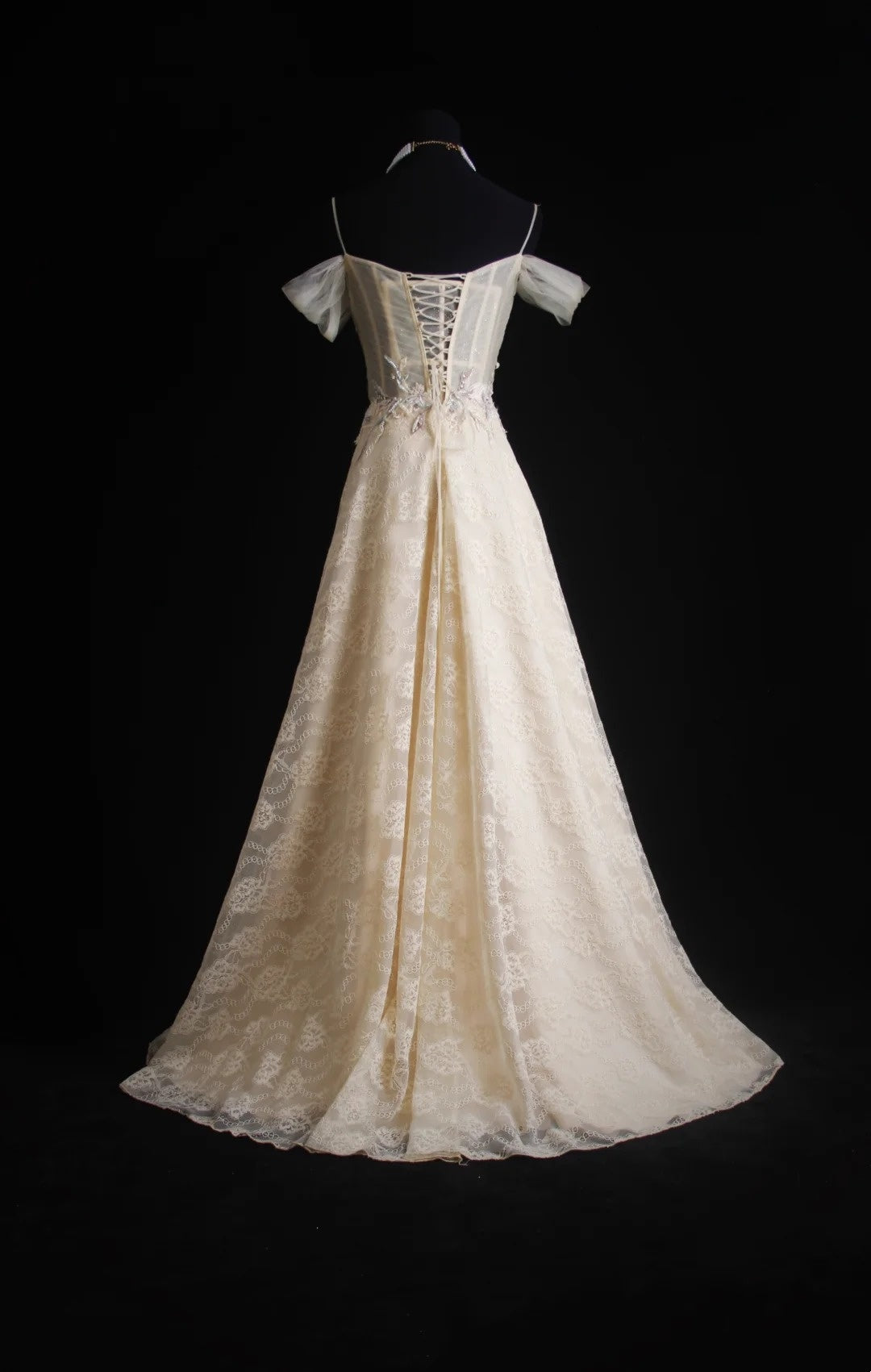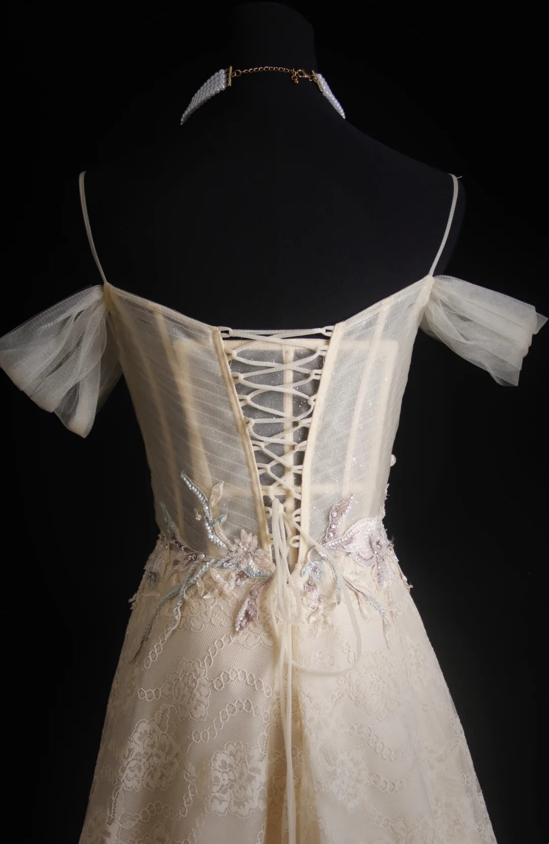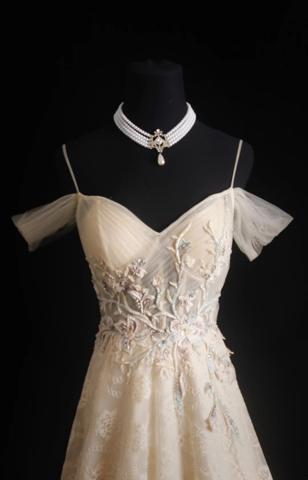 NiceVestidos--Milky Apricot Lace - Embroidered Tulle Spaghetti - Strap Off - Shoulder Floor - Length Evening Dress NV5826