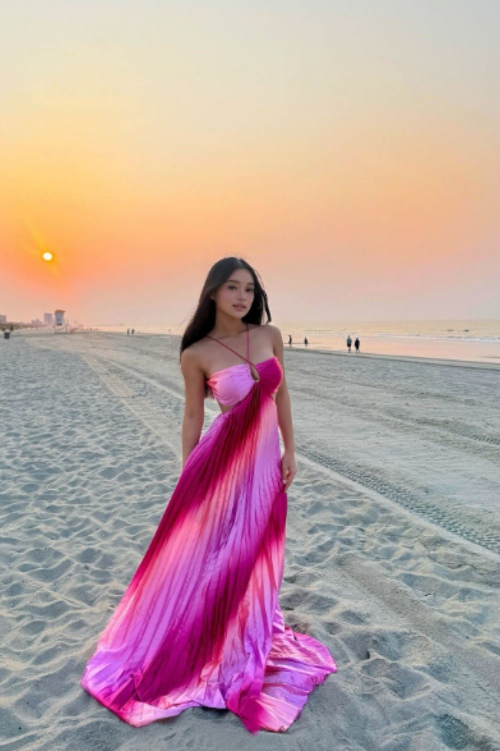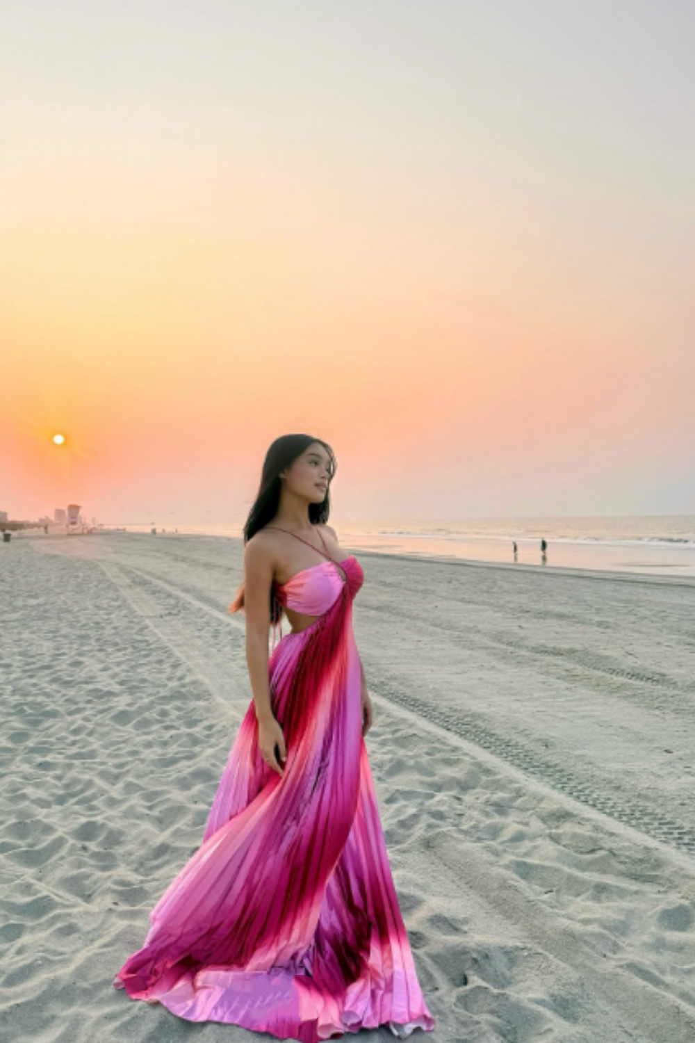 Red and pink gradient fashion suspenders long chiffon holiday party dress nv5407