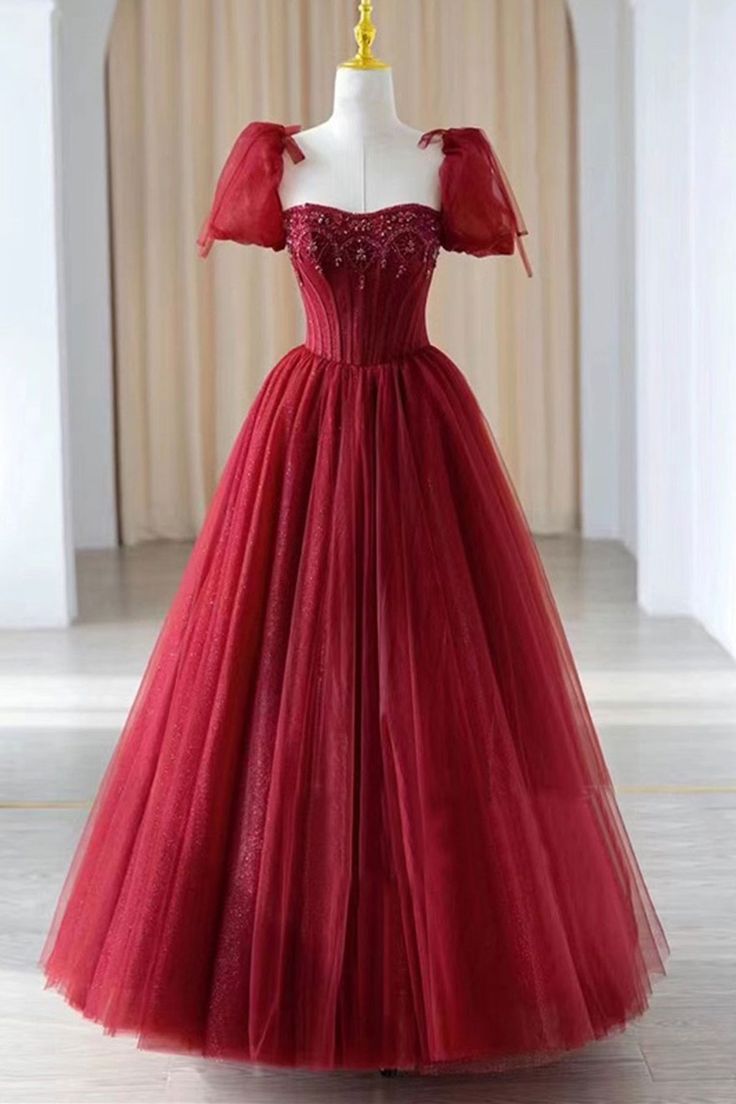 Red elegant beaded short sleeve long tulle ball gown evening dress nv3003