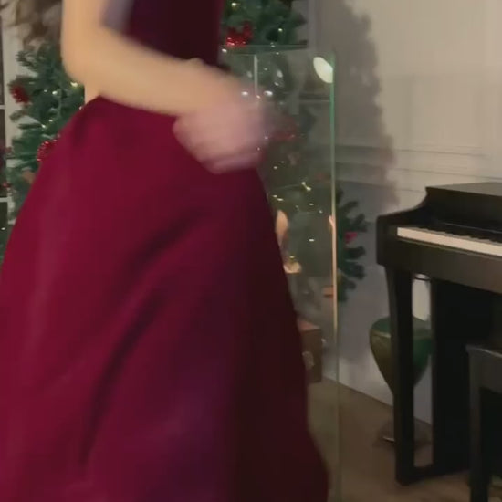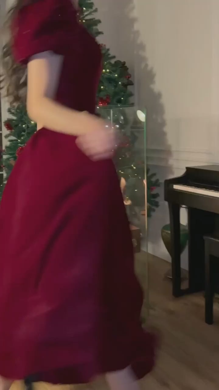 Red V-neck velvet puff sleeves short sleeves beaded A-line dress elegant prom dress graduation dress homecoming dress Christmas party dress nv2380