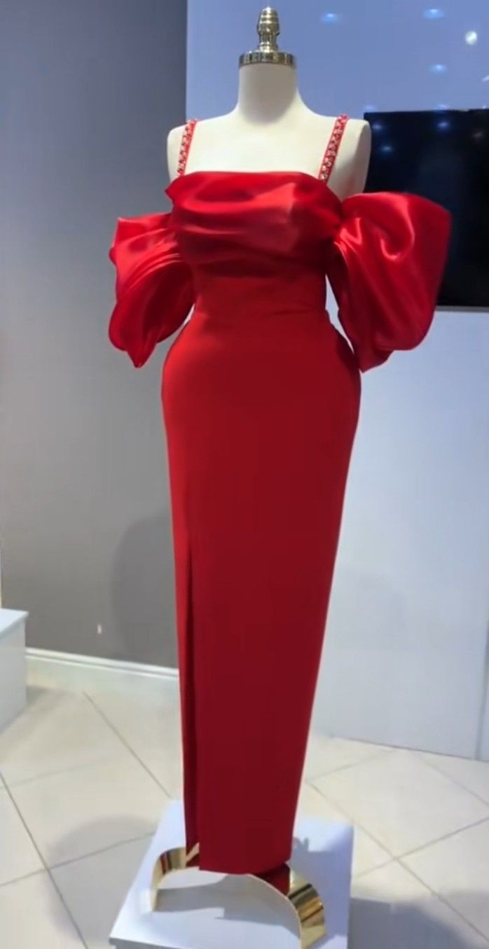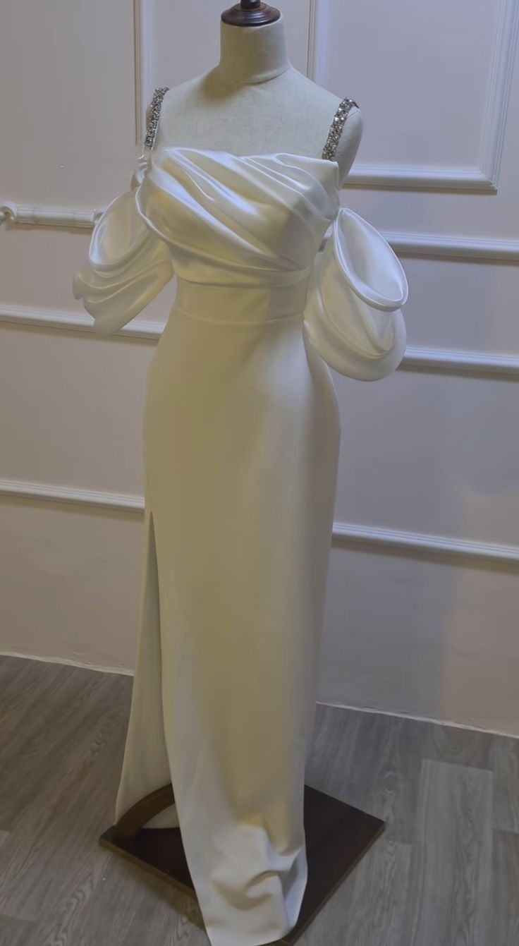 White/Red Rhinestone Decorated Straps Short Sleeve Long Slit Ball Gown Evening Gown Party Dress nv3062